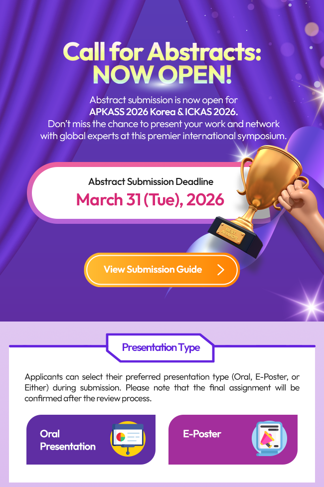 News & Notice [APKASS 2026 Korea & ICKAS 2026] Call for Abstracts: NOW OPEN! 조회수 : 24 게시일 : 2026-01-22 목록 수정 삭제